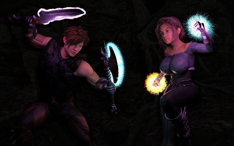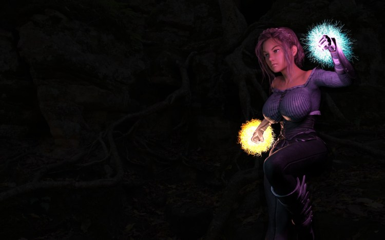 Nimble, smart, focused. The mage prefers magic spells and wands over melee weapons. Trying always to keep at a distance, clearing her way with magic fury, she will more often need to take refuge behind her sturdy shield when backed into a corner, as she prefers lighter armor which doesn’t impede her casting abilities.